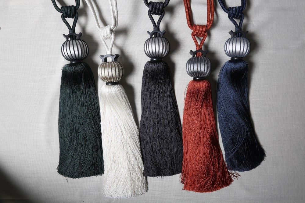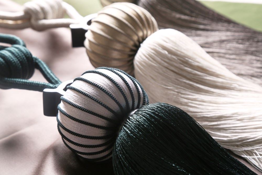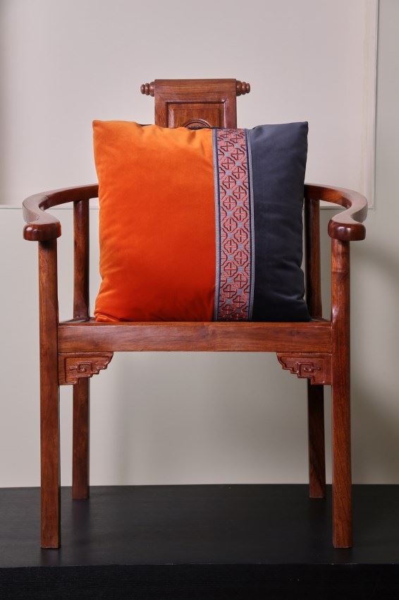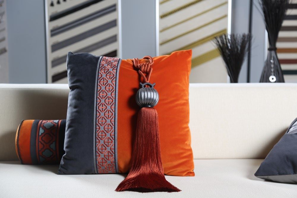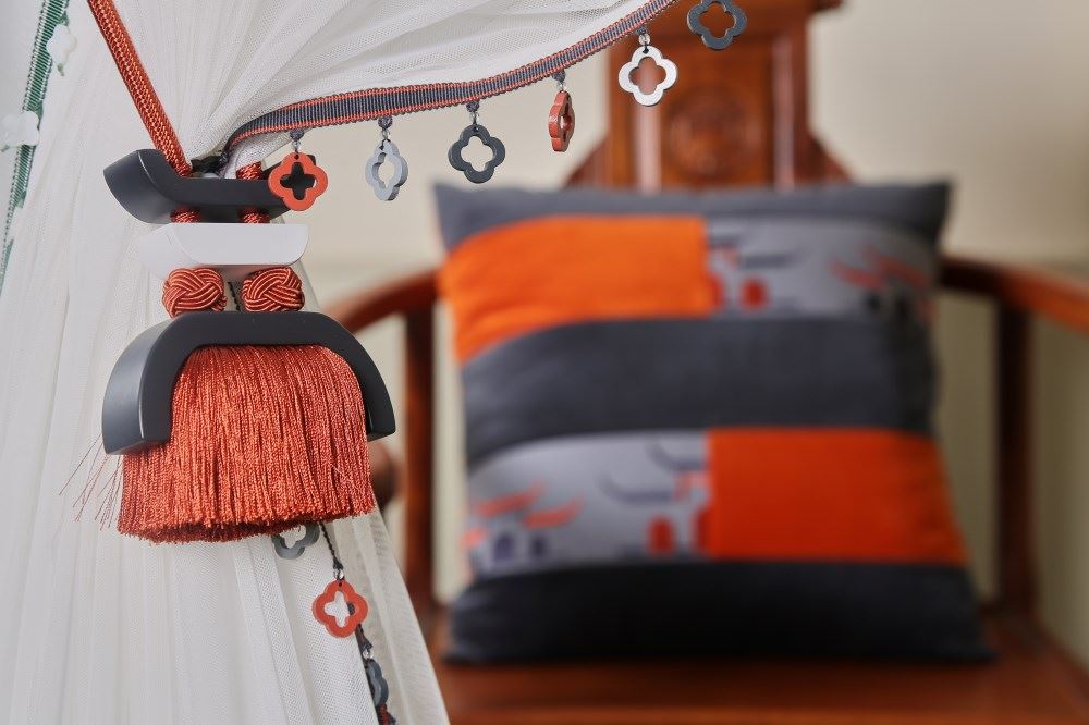 我們依據(jù)梅花窗的圖案,設(shè)計了兩款帶子,搭配窗簾和抱枕,把江南唯美的文化氛圍,通過與布藝的結(jié)合置入中式家居。