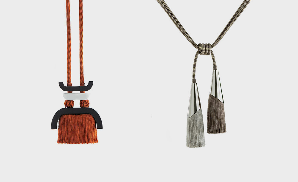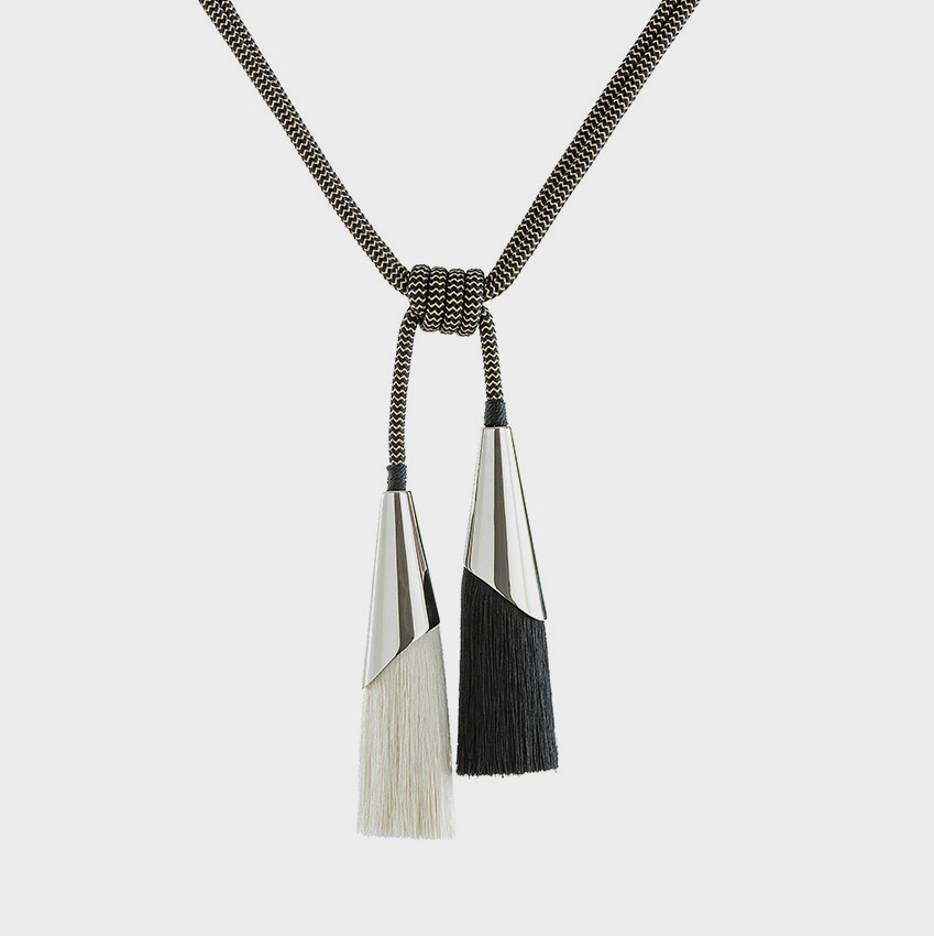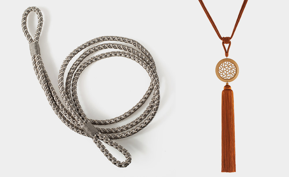 將蠟繩原料制作出仿皮效果后,交織成一根肌理清晰的粗繩,配上亞光的金屬接頭,呈現(xiàn)出硬朗與簡約。