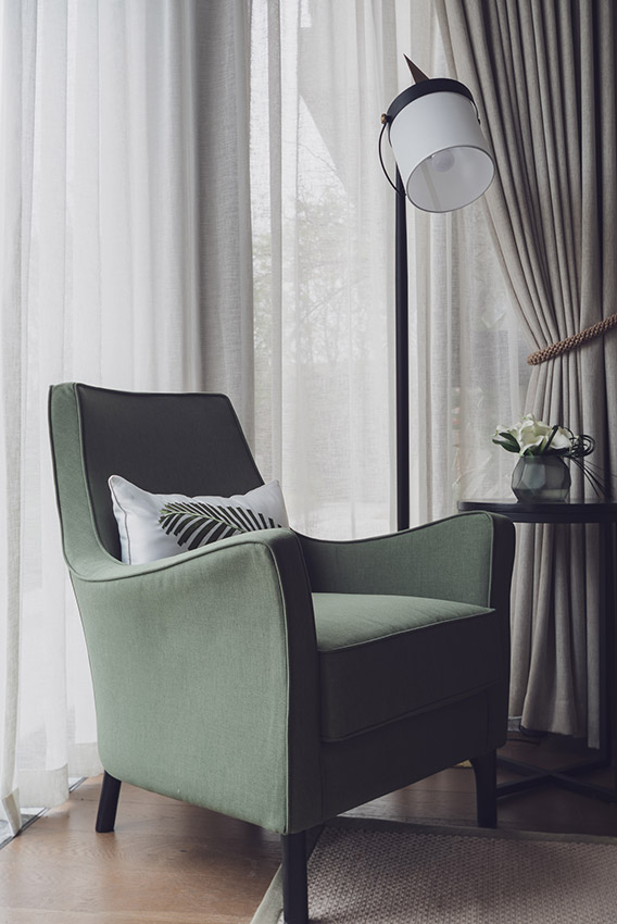 雖然只是一條綁窗簾的系帶,卻讓窗簾呈現(xiàn)弧線的造型而不是直挺挺的垂直,并且是目光焦點,風(fēng)格與品質(zhì)就在這一處點睛。