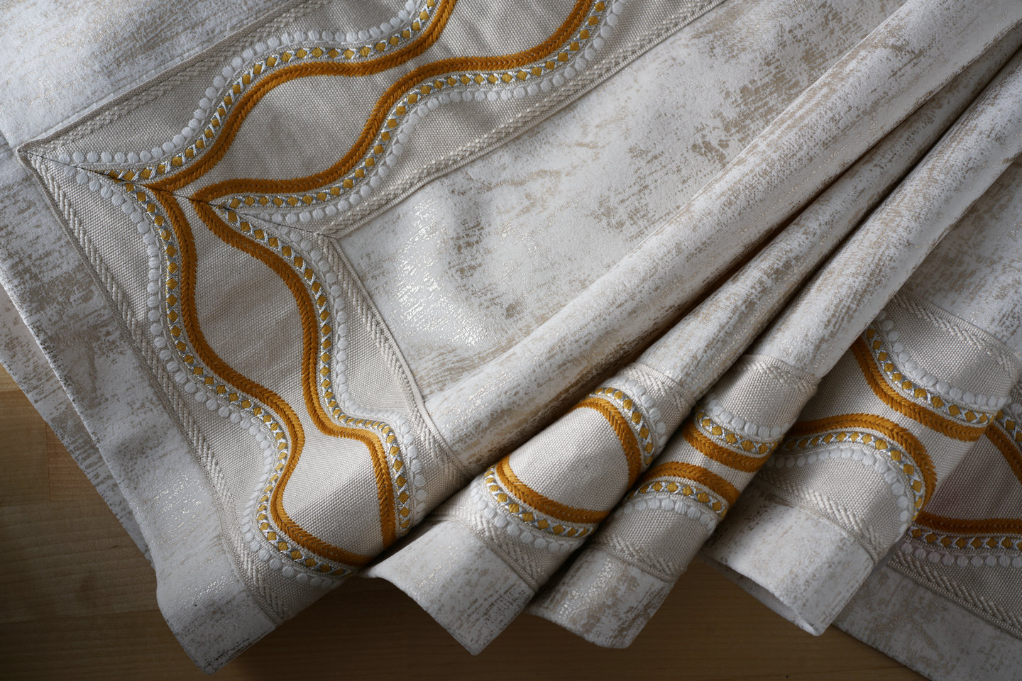以人棉為主要原料,呈現(xiàn)啞光的、柔軟的感覺,再加上一點(diǎn)點(diǎn)的金線,仿佛在平靜的水面上,波光粼粼的動感。